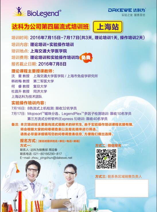 2016年達科為生物第四屆流式培訓班已經在全國各地火熱舉辦中,第七站上海培訓班經過前期的彩頁、海報的宣傳,報名工作已經接近尾聲。目前上機課程已滿,理論課程還有部分名額,感興趣的學員,歡迎報名,期待您的參與!