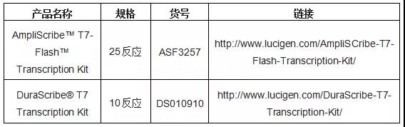 ● 提供解決IVT所面臨挑戰的可能方案,例如AmpliScribe? T7-Flash和DuraScribe? T7 轉錄試劑盒。