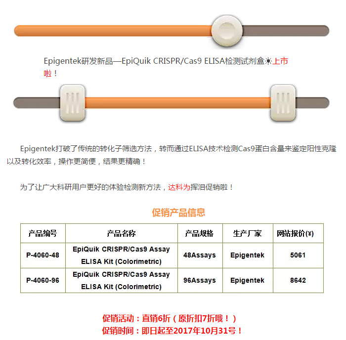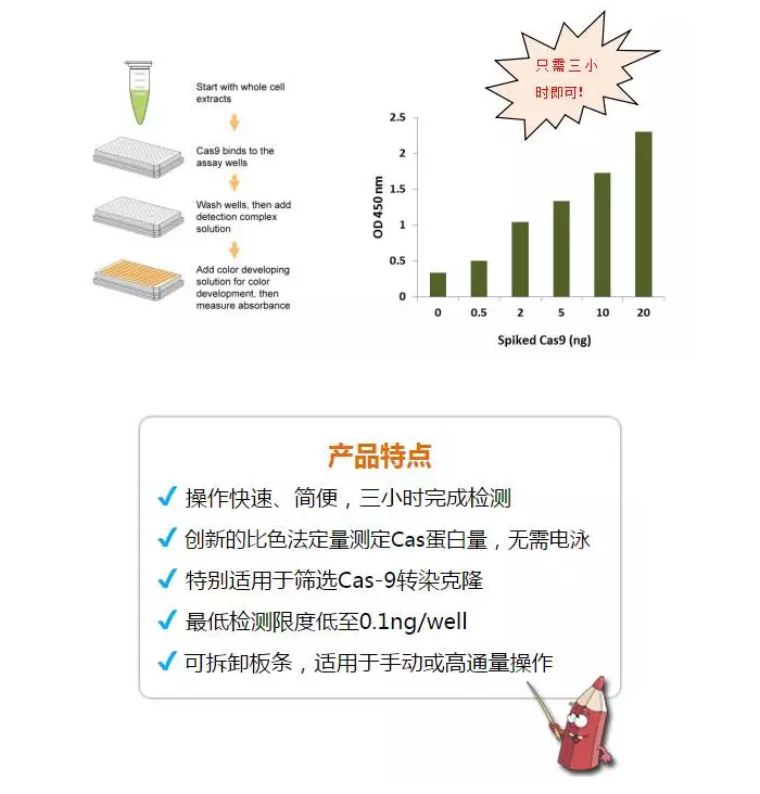 傳統(tǒng)方法操作復(fù)雜、花費大量時間與精力,針對這個特點,Epigentek研發(fā)出了通過ELISA檢測Cas9蛋白含量,進(jìn)而篩選轉(zhuǎn)化子的檢測試劑盒。該試劑盒僅需要純化的Cas9 核酸酶和全細(xì)胞提取物(分離自各物種的組織和培養(yǎng)的細(xì)胞),就能夠特異性定量檢測CRISPR相關(guān)蛋白9(Cas9,dCas9)。