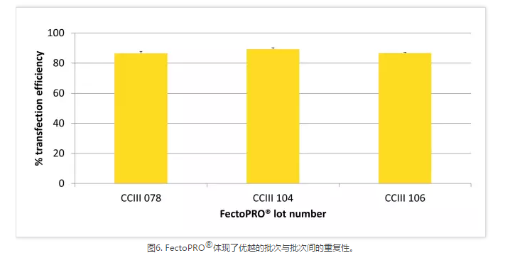 高質量質粒DNA的制備成本非常高,尤其是在進行大規模蛋白質生產時需要大量的DNA和許多質粒。FectoPRO?通過使用0.4~0.6 μg/106/ml的細胞培養液將DNA成本縮減了40%~60%,使其成為生物制藥生產流程的一項經濟實惠的選擇。