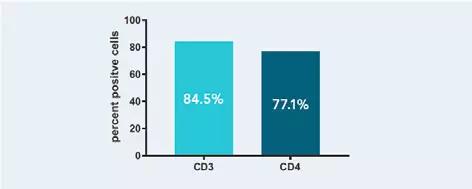 以Fab-TACS細胞分選重力柱分離CD3+及CD4+細胞,圖中為五次獨立實驗的平均分選結果。Fab-TACS科技能穩定的從全血中分選出多量的目標細胞。