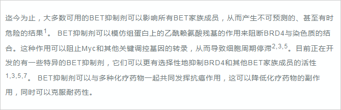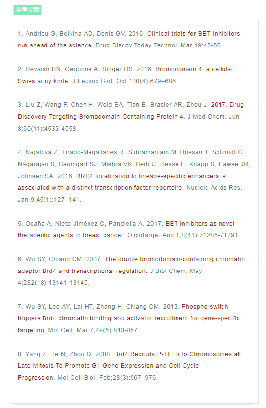 BRD4(溴結(jié)構(gòu)域蛋白4)是一種轉(zhuǎn)錄調(diào)節(jié)因子。研究發(fā)現(xiàn),BRD4在癌癥、自身免疫和炎癥性疾病中具有重要的作用1,2。 正常生理情況下,BRD4主要參與細(xì)胞周期過程中的基因表達(dá)調(diào)控,其可以與乙酰化染色質(zhì)結(jié)合,保持各種基因在細(xì)胞分裂循環(huán)過程中的穩(wěn)定表達(dá) ,這種現(xiàn)象被稱為表觀遺傳記憶或基因轉(zhuǎn)錄的“書簽”2,7。 同時,BRD4在調(diào)控分化和發(fā)育中也起著關(guān)鍵作用2,4。 如果BRD4缺失,骨髓干細(xì)胞將不能分化成為B和T細(xì)胞2。 BRD4亦是MEFs或B細(xì)胞重編程為誘導(dǎo)多能干細(xì)胞過程中重新表達(dá)干細(xì)胞基因所必需的,在成骨細(xì)胞分化過程中BRD4也發(fā)揮重要作用。 綜上,BRD4在細(xì)胞周期調(diào)控和分化中的重要作用使其成為癌癥和免疫系統(tǒng)疾病的新興治療靶點(diǎn)。