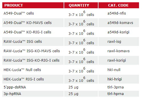 所有的RIG-I/MAVS報告基因細胞系均表達一個含有分泌型熒光素酶基因ISG(干擾素刺激基因)誘導型構件。活化RIG-I/MAVS信號通路可誘導ISG啟動子的活化并產生熒光素酶,該酶存在于細胞上清并能夠通過熒光素酶檢測試劑QUANTI-Luc?檢測定量。源于A549的細胞攜帶一個額外的NF-κB誘導表達分泌型堿性磷酸酶(SEAP)基因構件,該酶的活性能夠通過SEAP檢測試劑QUANTI-Blue?檢測定量。