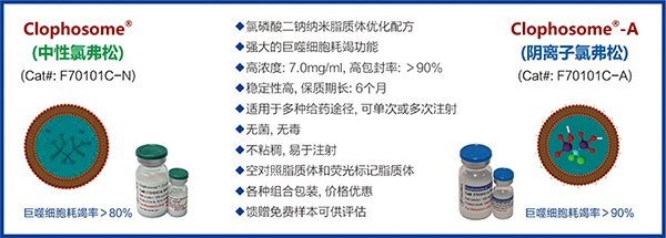 體內巨噬細胞耗竭(in vivo macrophage depletion)是巨噬細胞功能研究的重要方法之一。FormuMax公司推出的Clophosome?系列產品就是將膜不通透性的氯磷酸鹽—氯磷酸二鈉(clodronate)包裹于脂質體內并帶入細胞,利用巨噬細胞的內吞機制實現巨噬細胞的耗竭。