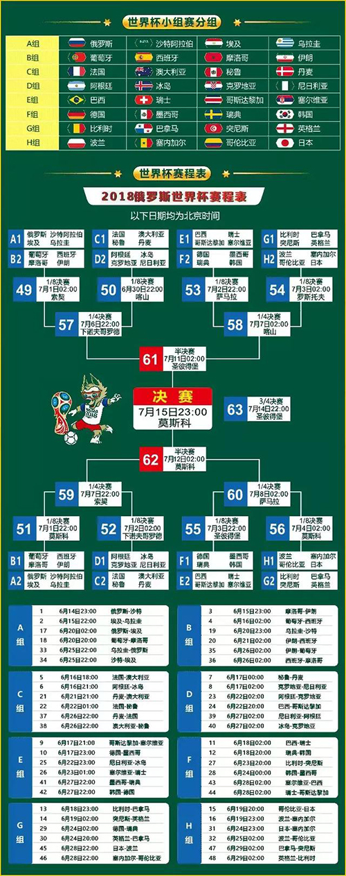 2018俄羅斯世界杯即將到來,這是世界人民的大party,無論您是忠實球迷還是偽球迷,您都會感受到世界杯帶來的熱情、純粹、肆意。我們可以把工作、煩惱拋于腦后,觀賞頂級足球賽事,茶余飯后和大家有聊不完的話題,或在酷熱的天喝啤酒。各位大俠,請收下這份2018世界杯賽程表,今年大力神杯會留在歐洲還是南美,讓我們拭目以待~