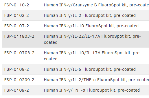 通過分泌單,雙和三色細(xì)胞因子分析劃分功能性T細(xì)胞亞群在許多不同的研究領(lǐng)域均引起極大的興趣。FluoroSpot可用于疫苗開發(fā),主要用于檢測(cè)和分析疫苗特異性免疫應(yīng)答。在癌癥研究中,F(xiàn)luoroSpot可用于,例如監(jiān)測(cè)腫瘤浸潤(rùn)淋巴細(xì)胞或通過同時(shí)分析IFN-γ和顆粒酶B的分泌,以提供細(xì)胞毒性T細(xì)胞反應(yīng)更直接的評(píng)估。Mabtech公司提供了各種不同的熒光斑點(diǎn)試劑盒用于單,雙和三色分析物的T細(xì)胞的分析,其中IFN-γ可單獨(dú)分析或與幾個(gè)不同的分析物同時(shí)進(jìn)行分析。