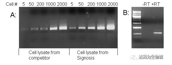 圖2 A: 比較Signosis與其他品牌的細(xì)胞裂解液。分別對裂解產(chǎn)物中的β-actin進(jìn)行30個(gè)循環(huán)反轉(zhuǎn)錄PCR。