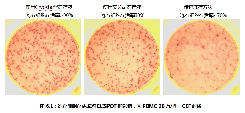 考慮到ELISPOT檢測的特殊性,荷蘭U-CyTech公司經過精心的研究與反復的驗證,推出Cryostar?凍存試劑盒,在凍存液中添加了一系列對細胞有特殊保護作用的保護劑。達科為公司在接到Cryostar?凍存試劑盒之后,在我們的實驗室以及國內數家客戶的實驗室做了細胞凍存與復蘇的實驗,并且對復蘇之后的細胞做了ELISPOT檢測。結果表明,淋巴細胞的存活率超過90%,ELISPOT斑點形成頻率與新鮮細胞完全相同。參見圖6.1。