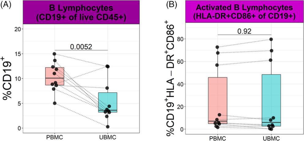外周血B細(xì)胞CD45+CD3-CD19+占總活CD45+白細(xì)胞比例高于胎盤床樣品分別為10.34 ± 0.94%5.36 ± 1.33%)(6A。為了研究B細(xì)胞的活化狀態(tài),本文還檢測CD86和人類白細(xì)胞抗原HLAII類分子HLA-DR的表達(dá)。外周血和胎盤床樣品中表達(dá)這兩種受體的B細(xì)胞比例相似6B
