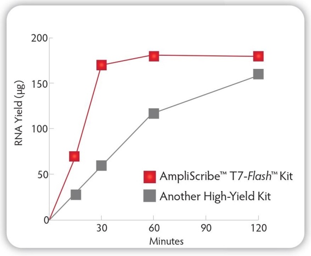△圖1 AmpliScribeT7-Flash Transcription Kit比競爭品牌更快獲得更高產量RNA