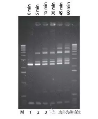 pUC 19 DNA用Pvu II消化,然后按標準連接反應使用2U Fast-Link? ligase進行連接(泳道1-6). 泳道 M,1-kb ladder;泳道1,無酶對照;泳道2-6, 分別為5 min, 15 min, 30 min, 45min, 1 hr連接結果。